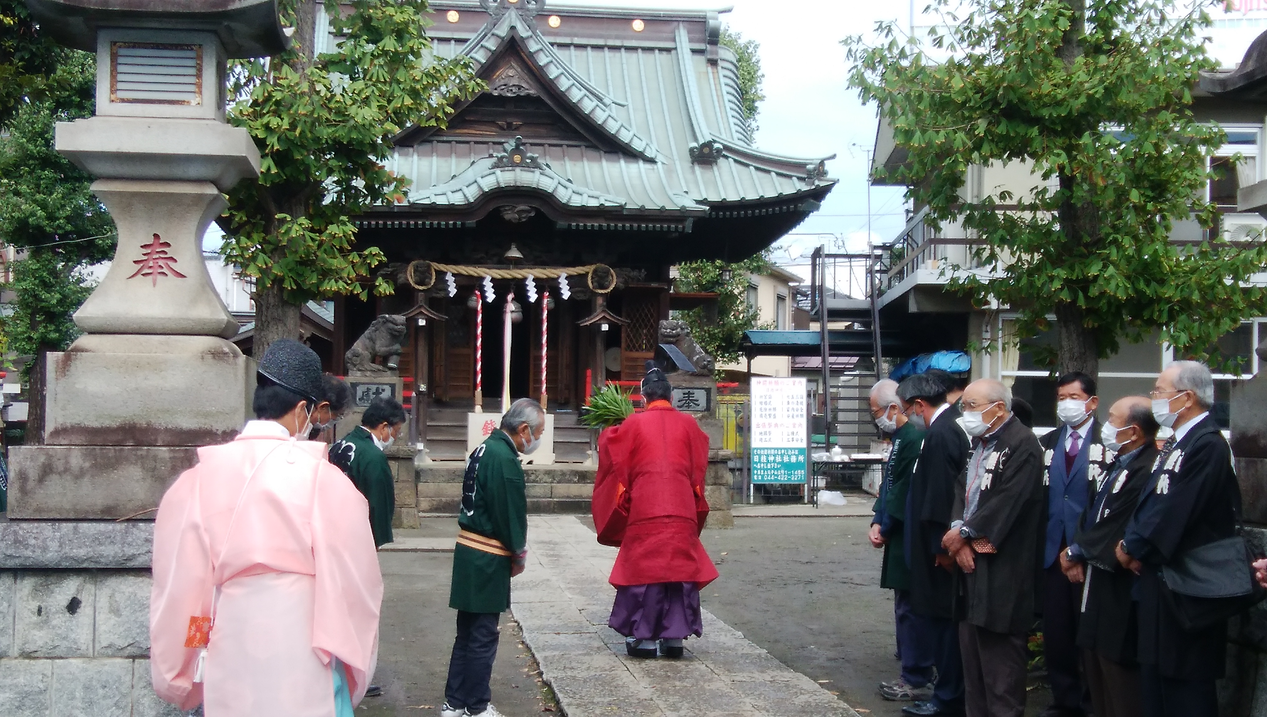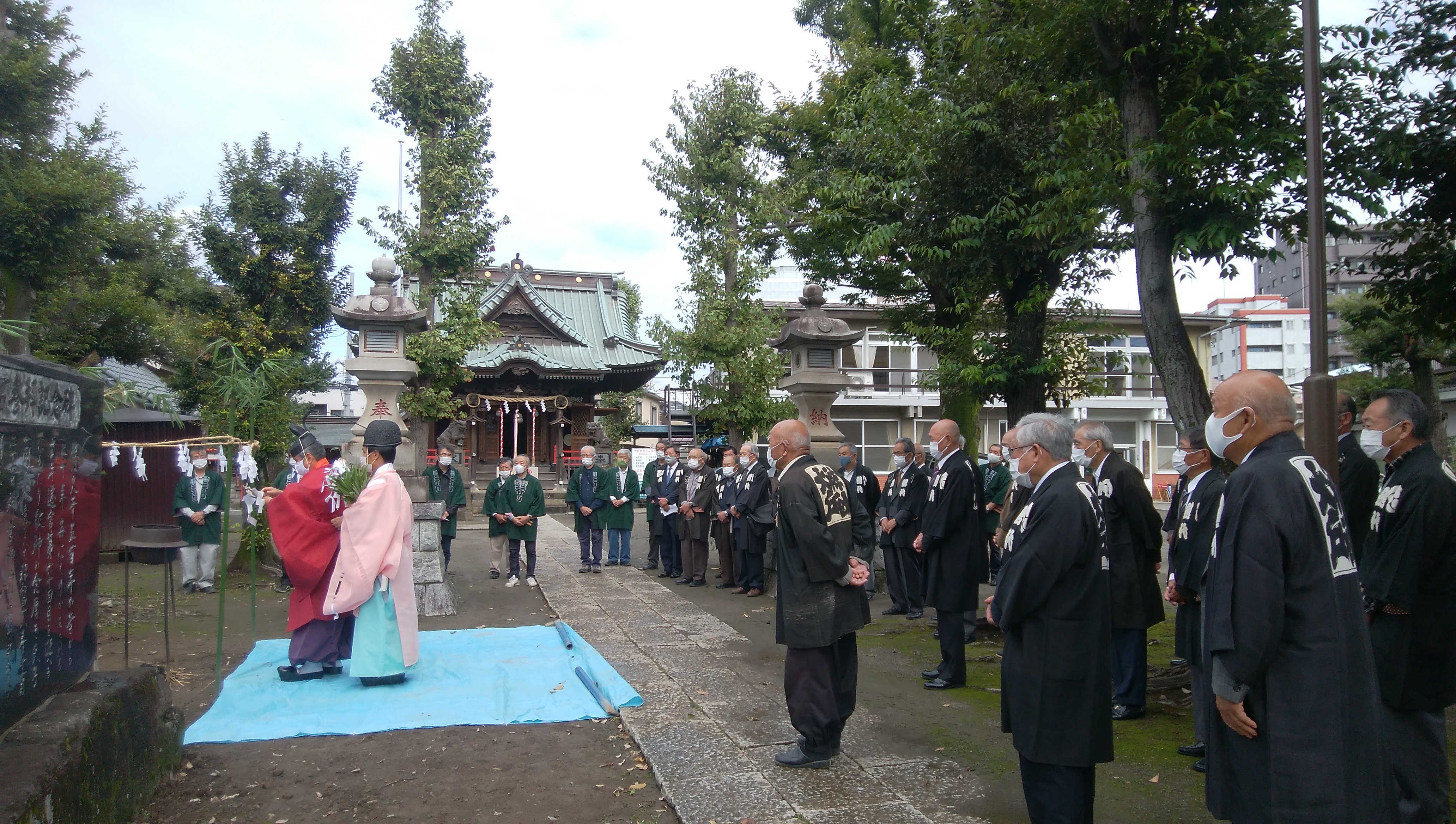 して加わり、総代役員会に出席します。又、神社の行事は、町会長より通知が来ます。神社の年間行事(元旦祭・初午・夏祭り・秋季例大祭・昼食当番・二の酉)は、下小田中6町会に、毎年何かしらの当番が回ってきます。その準備のため、町会員の皆様が協力してくださいます。とくに秋祭りは、神酒所作りや山車の町内巡行など、いろいろな担当があり、大変多くの方が参加協力して下さいます。 大戸神社の清掃は、1月と7月が当番で多くの町会員様が参加して下さいます。 写真は秋季例大祭の式典です。