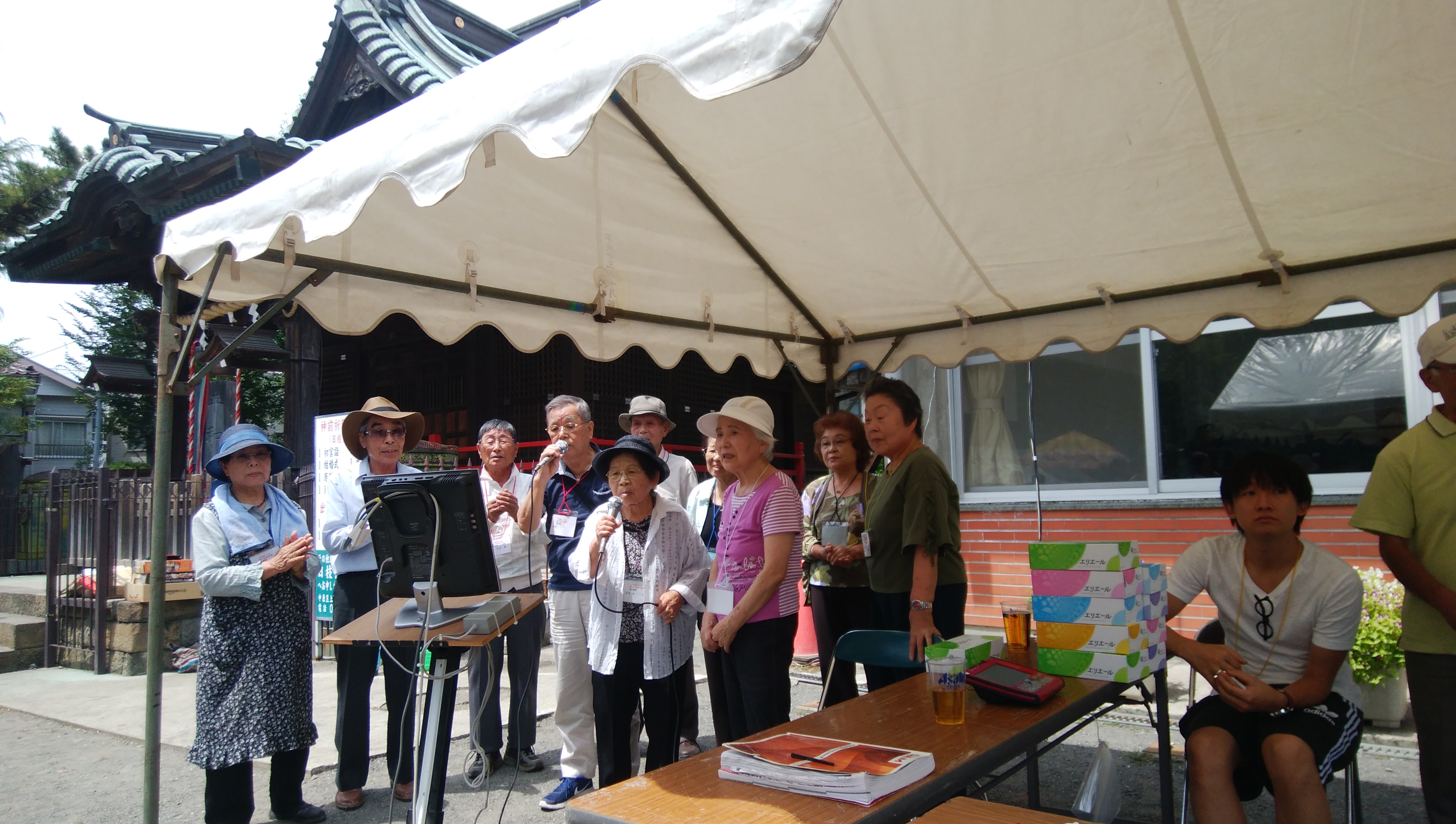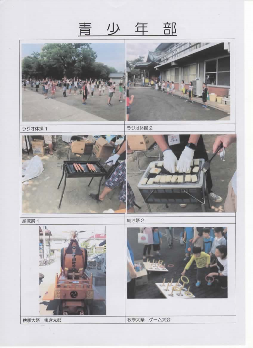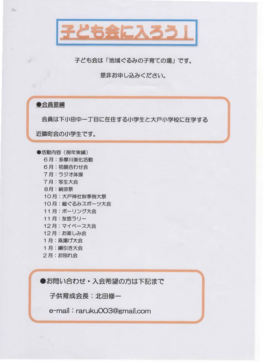 文化部の主な行事として、下記2つを実行しています。 (1)納涼の集い (2)町内親睦旅行 今回は、子供達も沢山参加する「納涼の集い」を、ちょっと詳しく紹介させてもらいます。 「納涼の集い」は、8月の後から2番目の日曜日に、下小田中一丁目「大戸神社」の境内で実施します。 親子全員集まっての、屋外での食事会です。 町内会親たちによる、焼肉、焼き鳥、焼きそば、お餅、カレー、カキ氷、飲み物(ジュース、ビール他) ゲーム(景品付き)、カラオケ・・・・・。盛り沢山です。シートに座ることもできます。 ”夏休み最後を、家族全員で楽しんでください” ”町内近所、親子共々、忌憚なく会話、食事、カラオケを楽しんで下さい。” (”最終日曜日には子供たちの夏休みの宿題を終えてください”) 会費は有料です(千円程度)。事前予約を募りますが、当日予約なしでもOKです。 雨天の場合は、大戸神社本館内で実施となります。