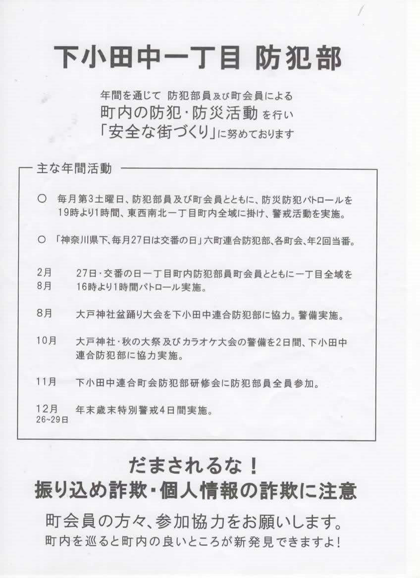 交通部の活動は、上の表に示すように年間を通じて、町内の交通安全・事故防止に努めています。また、下小田中交通部連絡協議会の一員として、他町会の交通部員と協力し、下小田中地域の交通安全に寄与しています。 以下に主な活動の取組みは 1.学童の通学安全指導(行政と連携) 春・夏・秋及び年末の全国交通安全運動期間と神奈川県独自の毎月1日(県民交通安全の日)・ 15日(高齢者交通安全の日)に 実施しています。 【朝7:30~8:20実施】 大戸小学校通学路は、中原街道横断部や中原駅へ向かう通勤者等で混雑区間があり、交通部員(4地区×2名で8名)のみでは行 き届かなく、一般町会の皆様にも参加をお願いしていますので、協力して頂ける方は宜しくお願い致します。 登校児童と挨拶を交わすことは、交通安全だけでなく、スクールガード要員と同じく防犯面(児童の見守り)でも効果を発揮し ています。 2.朝・夕の自転車マナーアップ運動(下小田中交通部協議会) 9月~3月までの時期には、朝及び夕方の通学路及び通勤者の自転車の走行が増加することで、 マナー違反が目立ちます。自転 車の右側通行及び無灯火の注意喚起を下小田中交通部および中原警察署・区役所・交通安全協会と共に行っています。 3.大戸神社行事への参加 盆踊り(8月)、秋季例大祭(10月)、大晦日・初詣(12月)では、神社に集まる皆様の安全を守るため、交通整理を実施して います。 また、例大祭では、神輿巡行が滞りなく行えるよう、下小田中交通部と共に事故・渋滞防止に努めています。