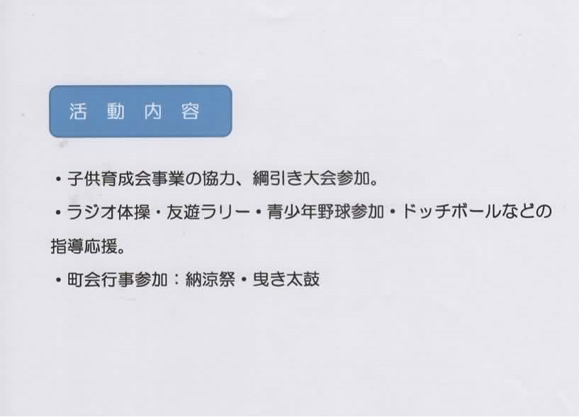 | 婦人部自主活動 | 総会・定例会・新年会各種講座・日帰り旅行・ウォーキング・ハイキング |