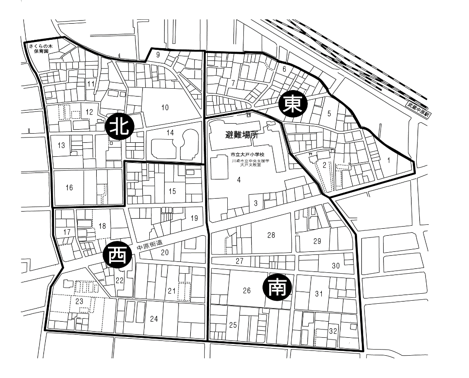 町会の運営に当たっては、地域を東西南北の四つの地区に分け、地区ごとに副会長以下それぞれ組織化しています。